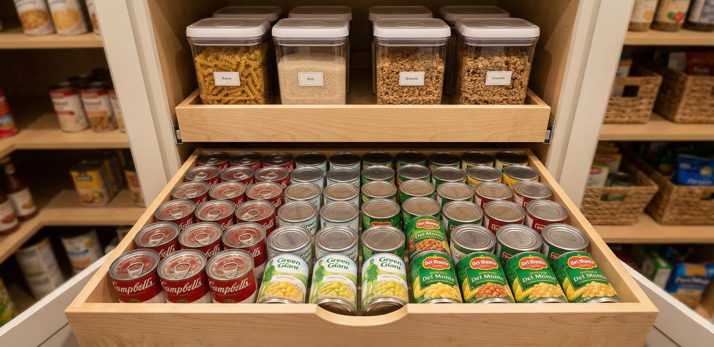 Pull-out drawers work especially well for canned goods, which stack poorly and are notoriously hard to see when stored behind taller items. A deep drawer that can be fully pulled out reveals every can at once, eliminates the double-stacking problem, and makes restocking from a grocery run faster and more intuitive.