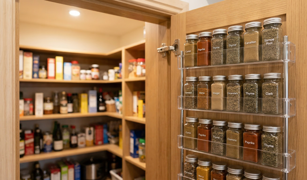 The back of a pantry door is among the most underused storage surfaces in most kitchens. Door-mounted racks add usable storage for flat items and spice collections without occupying shelf space. A door-mounted rack with individual labeled slots keeps the entire spice collection visible at a glance, arranged alphabetically or grouped by cuisine type. That alone eliminates the fumble-through-the-shelf search that a standard spice rack creates.