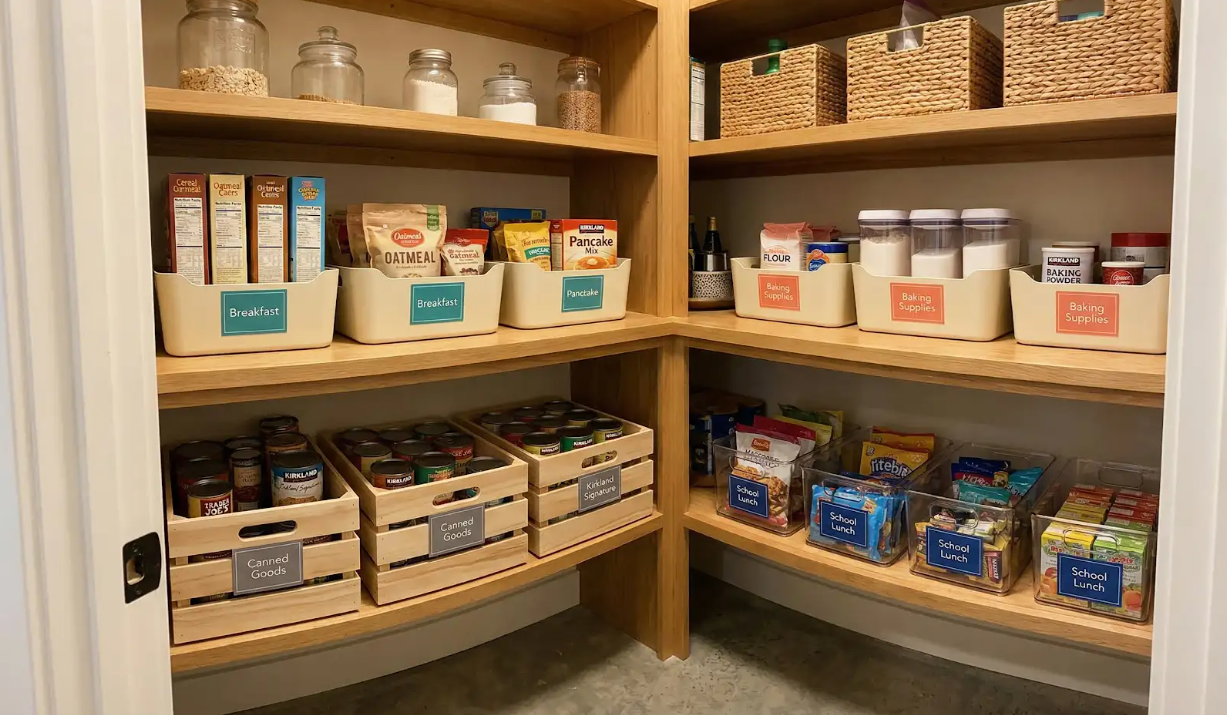 The final ergonomic layer is zone organization: grouping pantry contents by purpose (breakfast items, baking, canned goods, school lunches, cooking staples) and storing each zone in a consistent location. Zones work because they reduce decision-making on every pantry visit. You reach for the breakfast zone without scanning the whole pantry.