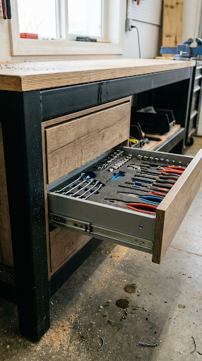 A workbench is only as good as the storage it provides. We eliminate the clutter of open shelving and generic bins by integrating specialized storage directly into the design.
